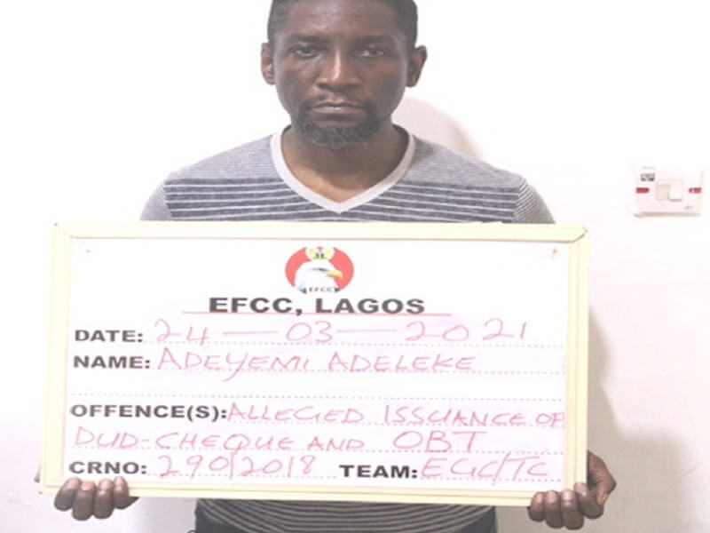 Operatives of the Lagos Zonal Office of the Economic and Financial Crimes Commission, EFCC, have arrested one Adeleke Adeyemi for his involvement in an alleged case of conspiracy, obtaining money by false pretense, diversion of funds, issuance of dud cheques, and money laundering to the tune of N800,000.00( Eight Hundred Million Naira).