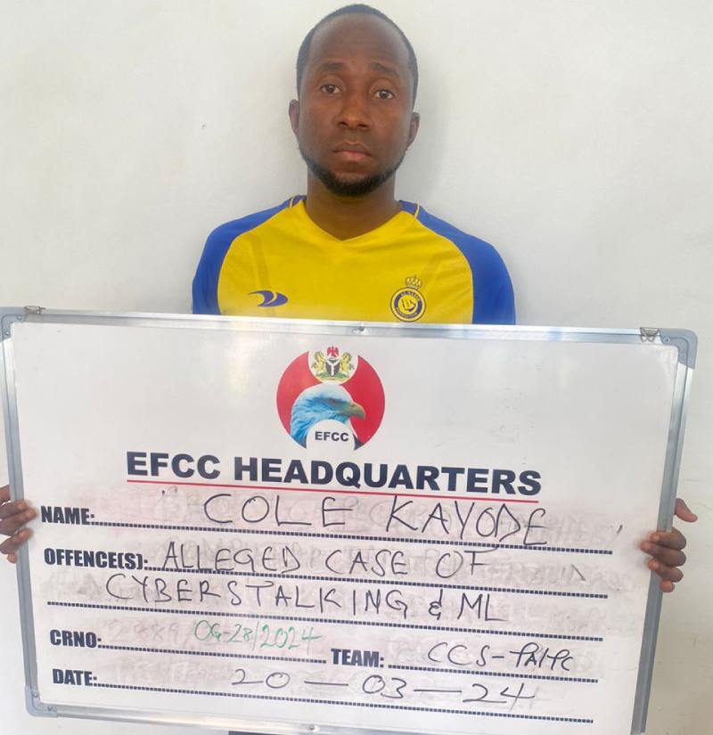 Operatives of the Economic and Financial Crimes Commission, EFCC, on Monday, March 18, 2024, arrested one Kayode Cole for issuing a death threat against the Executive Chairman of the Commission, Ola Olukoyede.